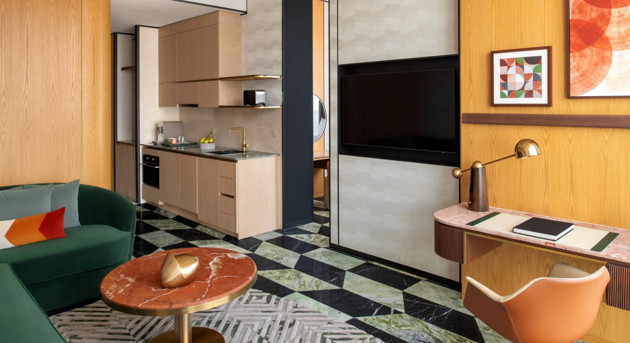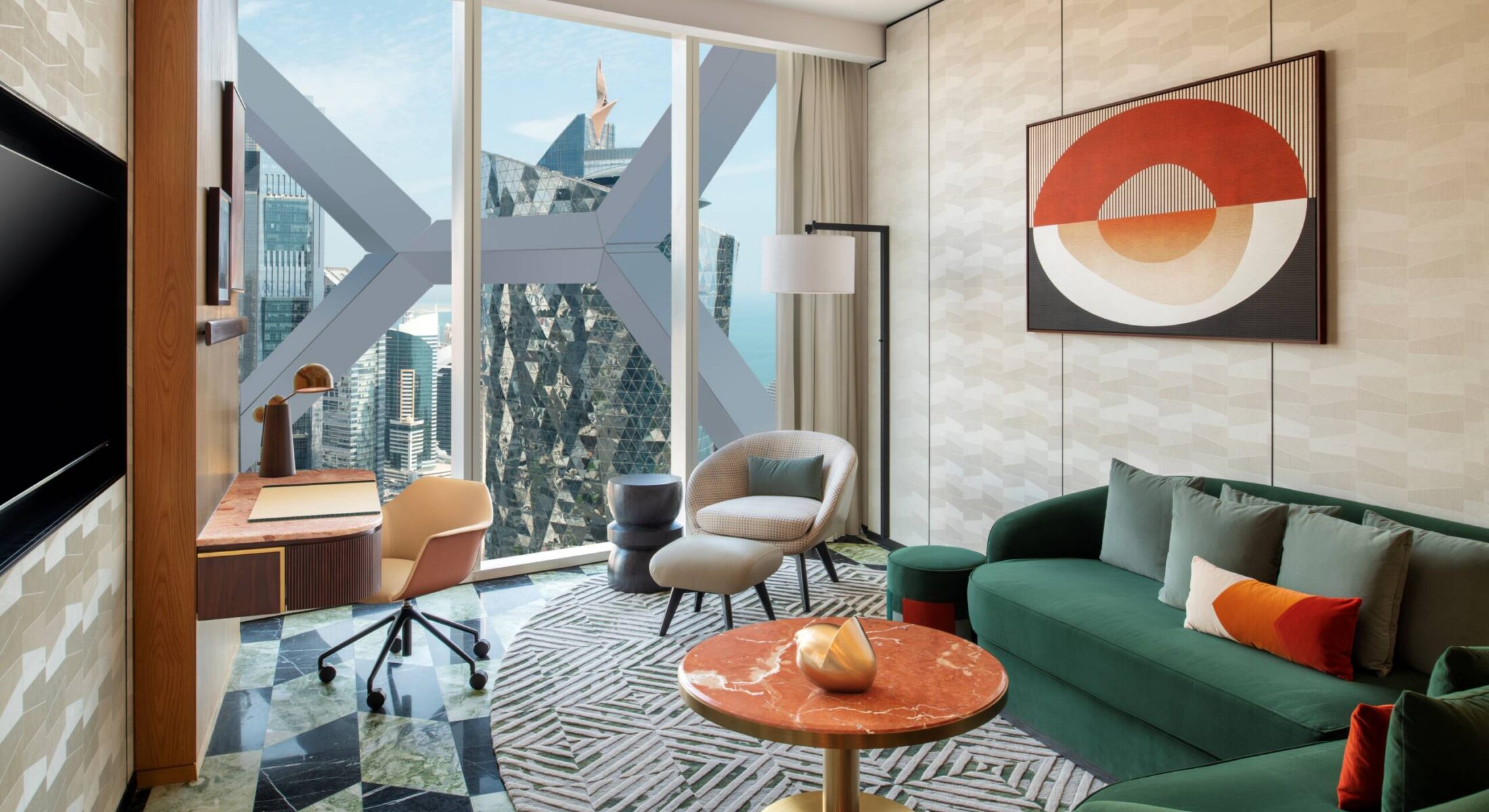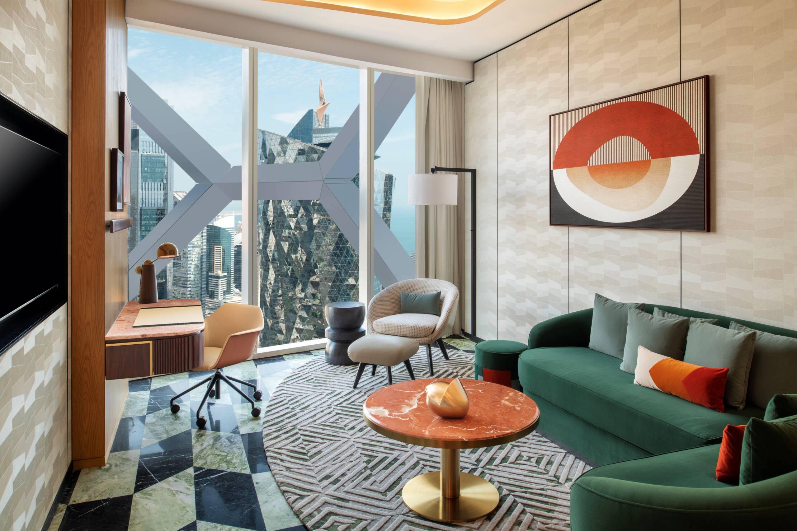 With ample, intelligently designed space and elevated city views, our One-Bedroom Apartment tempts you to stay awhile. Picture sophisticated soirées hosted in the separate living room, or romantic dinners for two prepared in the green-and-black-marble kitchenette.