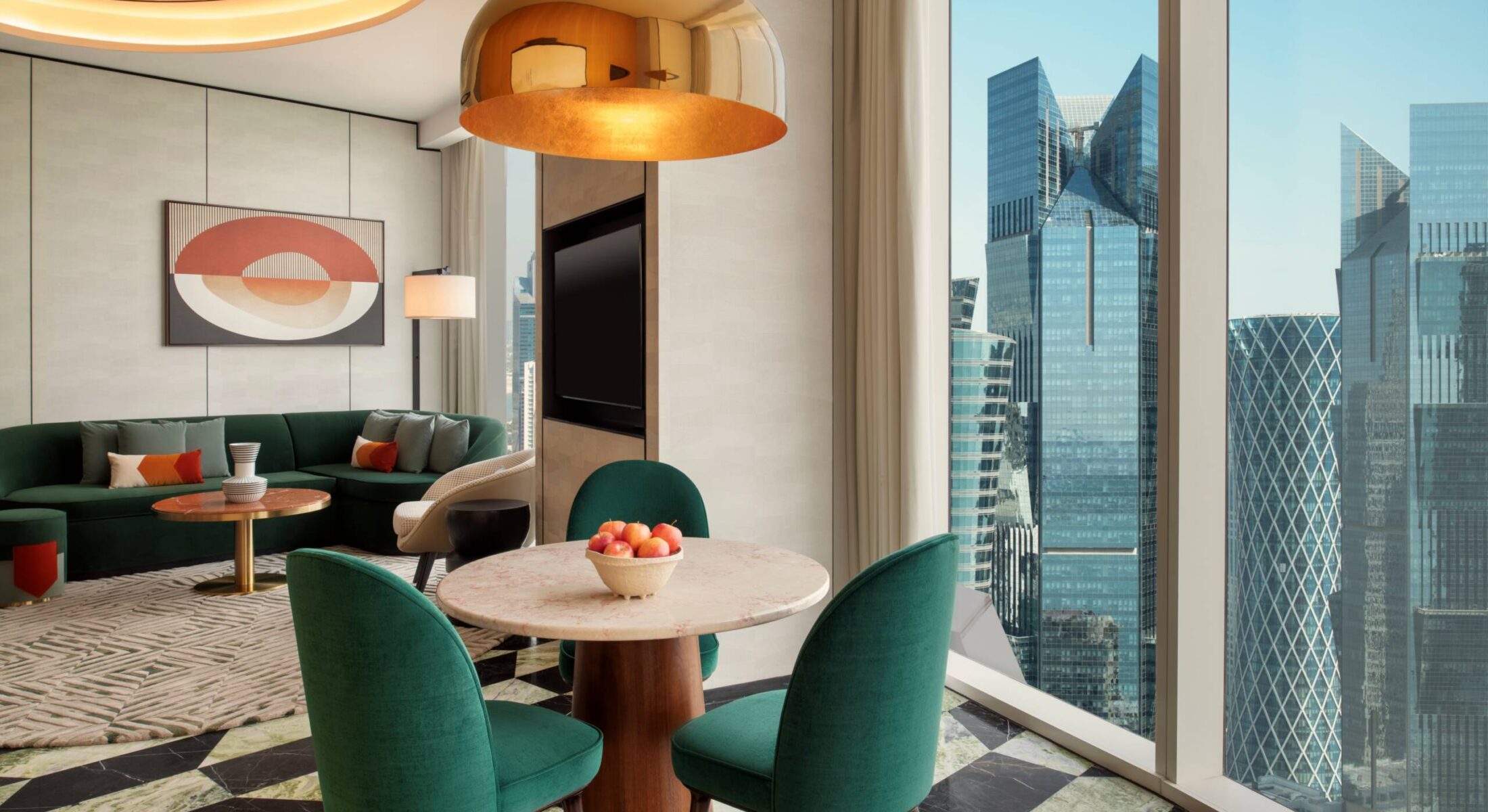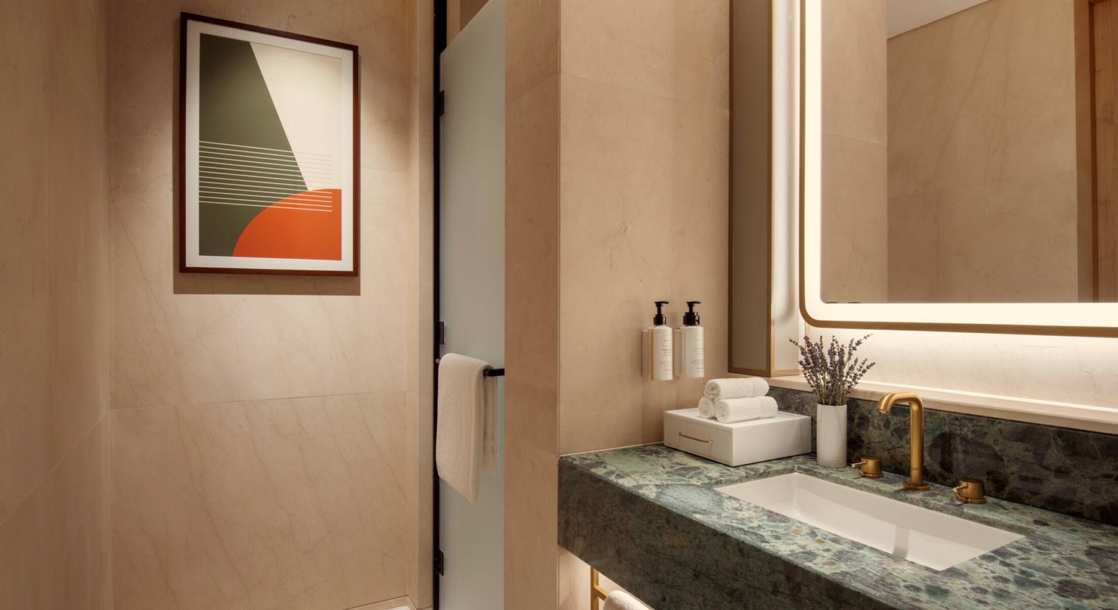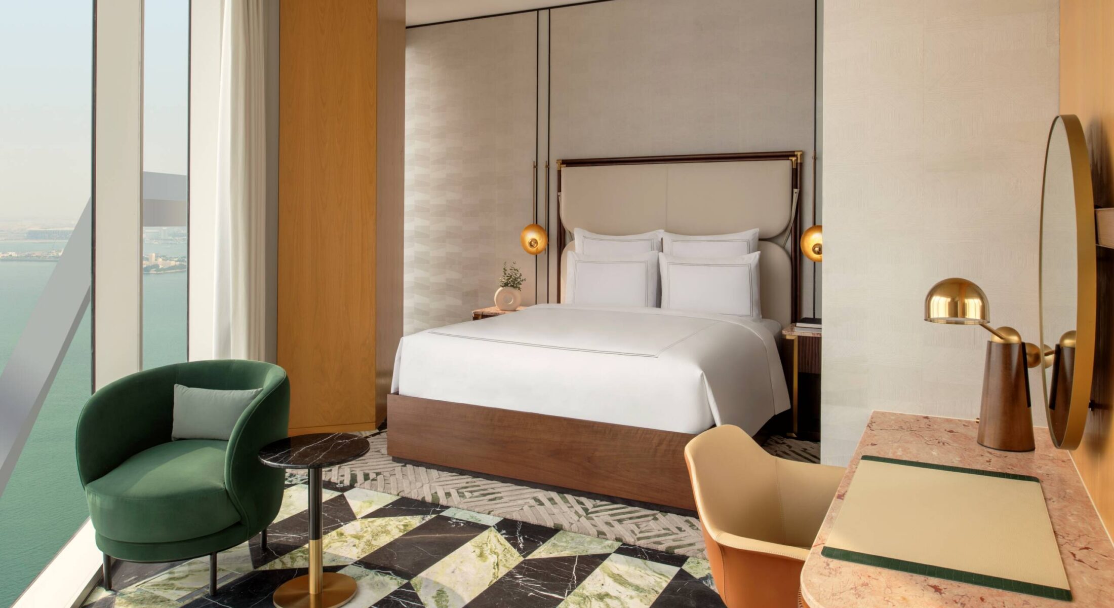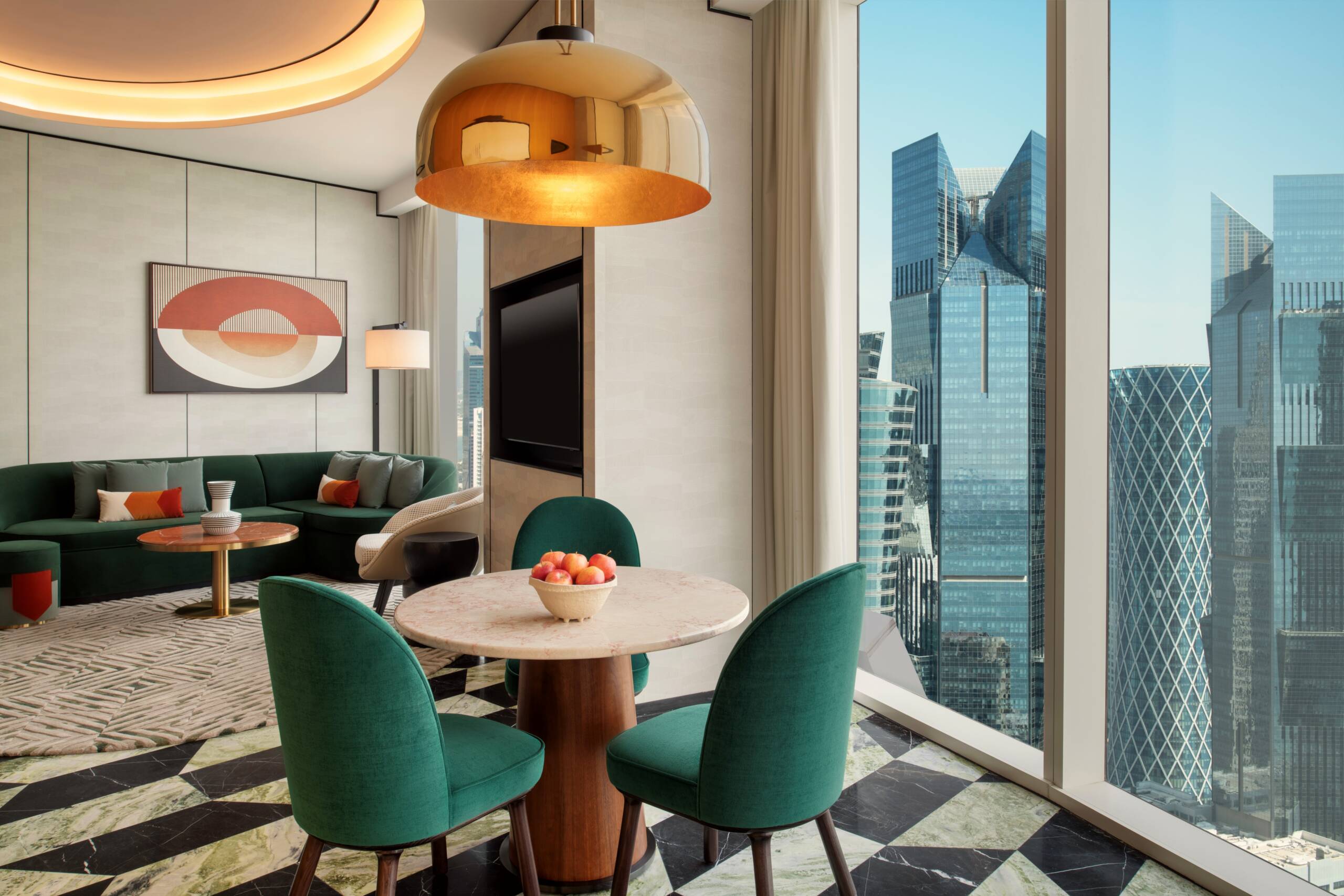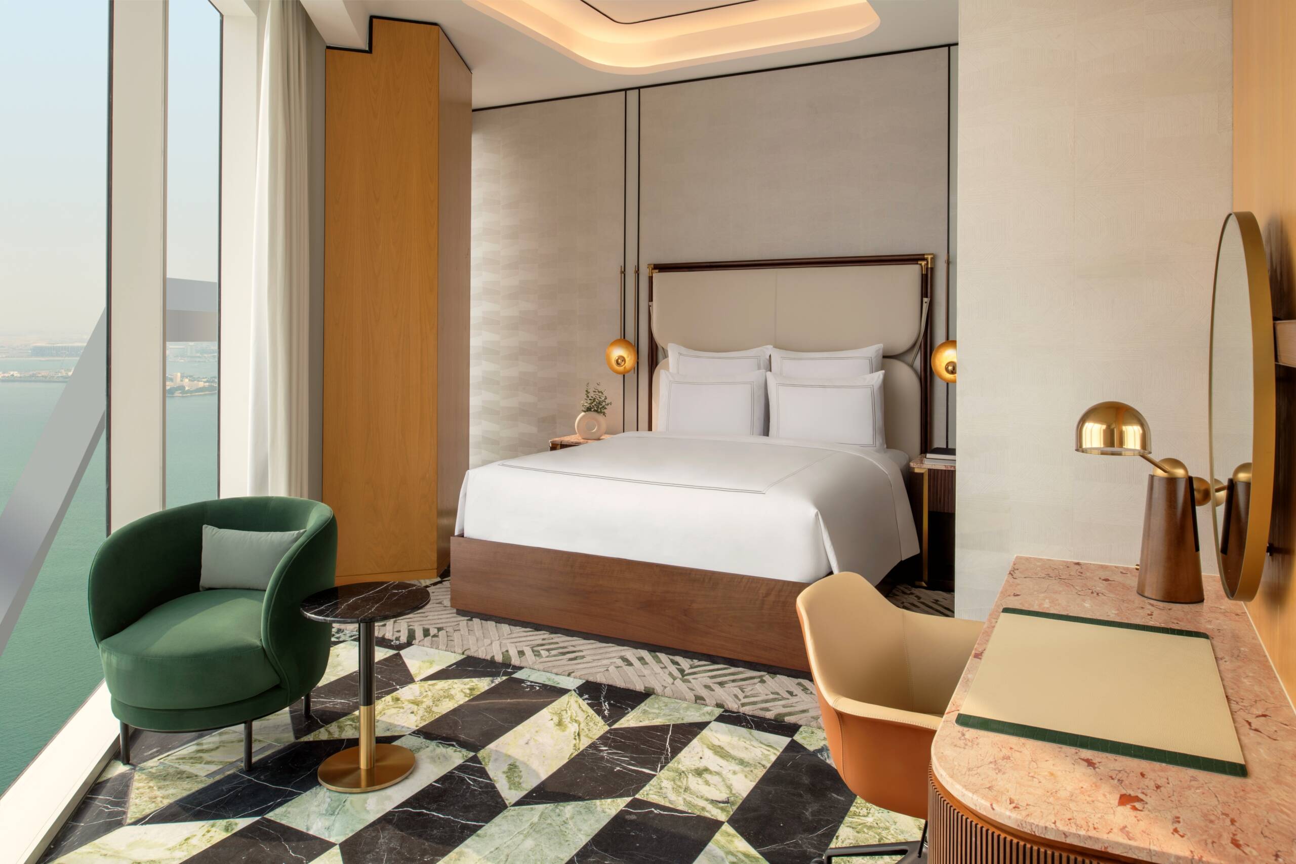 The design merges blonde wood and cool marble with cream and dove grey fabrics for a sense of nature-inspired balance. With a full kitchen and guest bathroom, the space is made for entertaining. Afterwards, the comfortable king bed and serene seating area set the stage for moments of uninterrupted peace and quiet.
